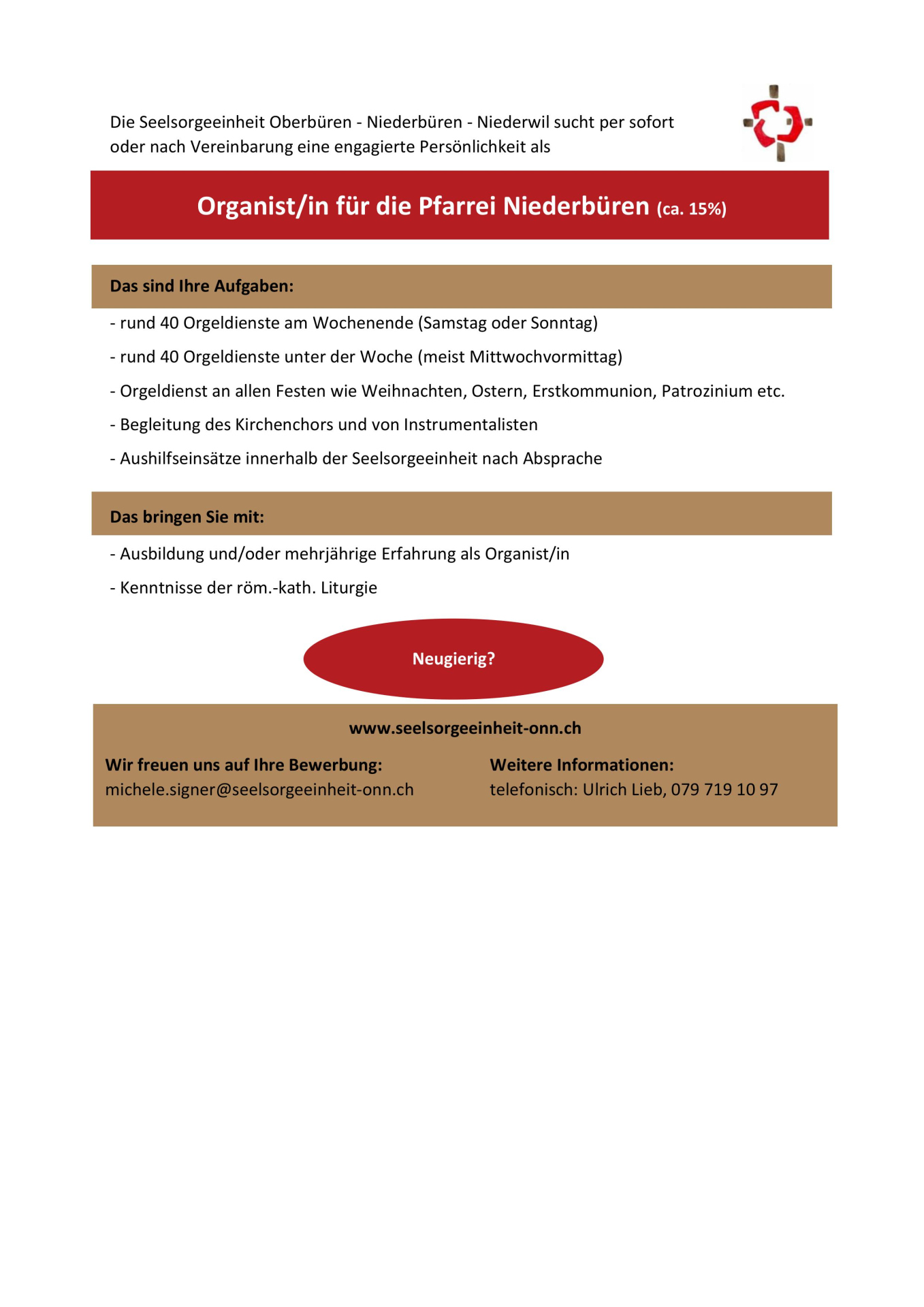 Wir suchen per sofort oder nach Vereinbarung eine/n Organist/-in (ca. 15%)